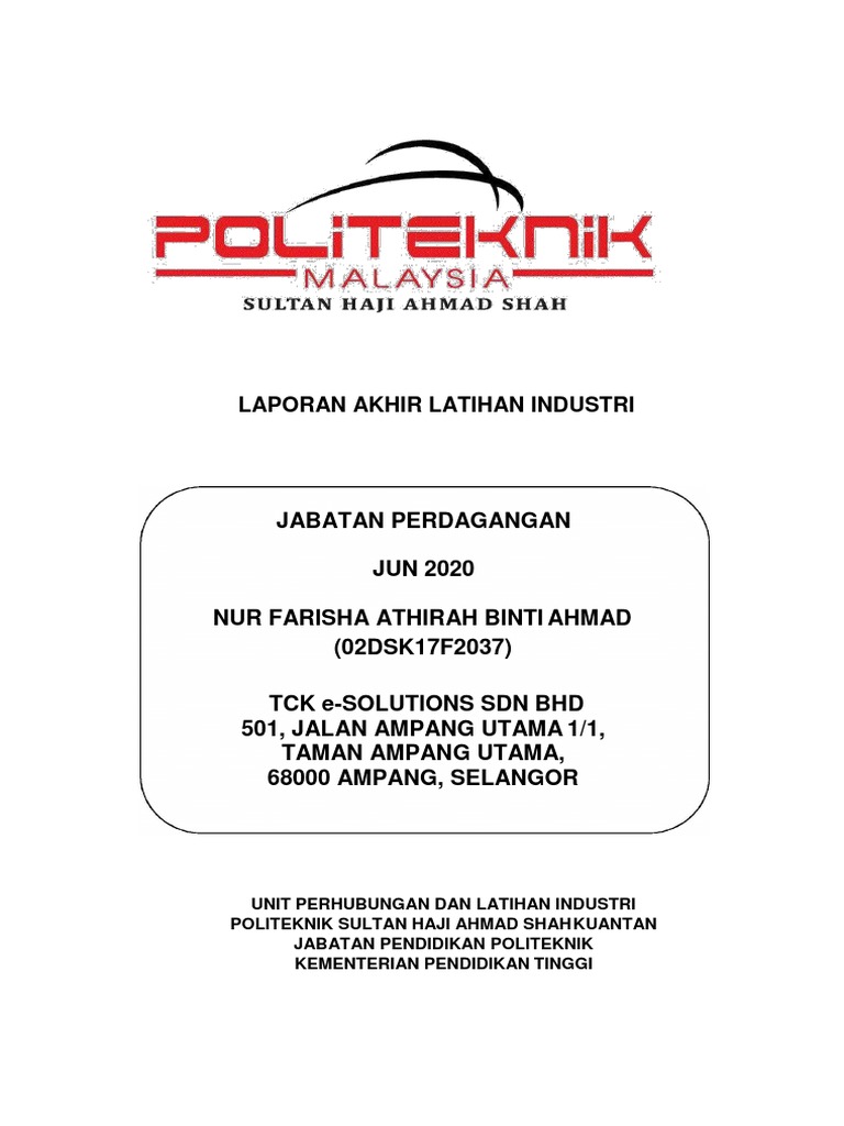 Laporan Akhir Latihan Industri Jabatan Perdagangan Laporan Akhir Latihan Industri Mahesan Studocu